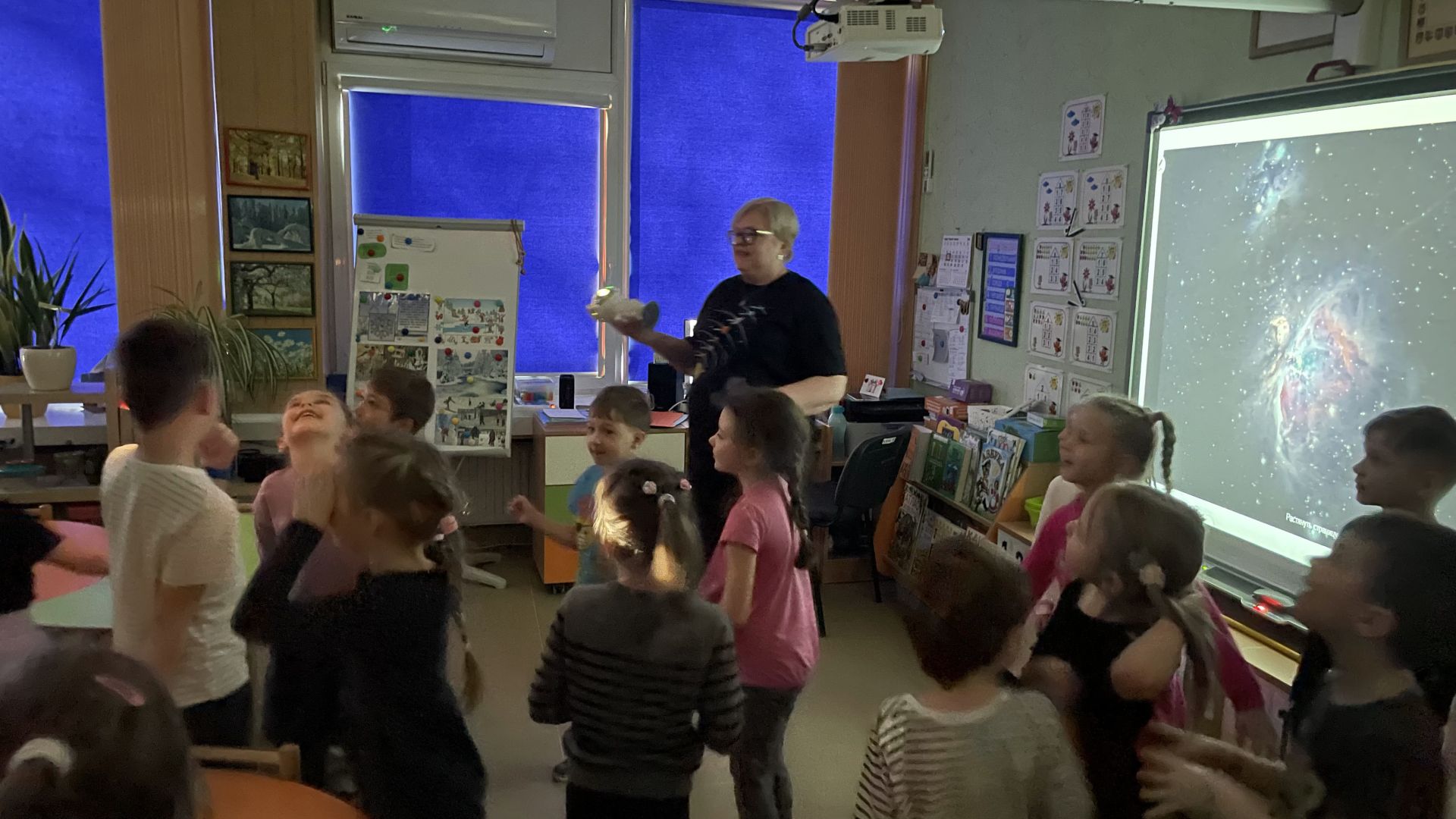 Žaidybinės veiklos metu vaikams buvo pasiūlyta neįprasta kelionė į „kosmosą“. Vaikai ne tik susitiko su visomis planetomis ir teisingai jas išdėstė Saulės sistemoje, bet ir pademonstravo savo gebėjimus spręsti galvosūkius naudodamiesi planšetėmis. Netikėtumu tapo susitikimas su „ateiviais“. Vaikai jiems papasakojo apie gyvenimą mūsų planetoje Žemėje, mokė lietuvių kalbos, atskirti gimtosios kalbos raides ir garsus.